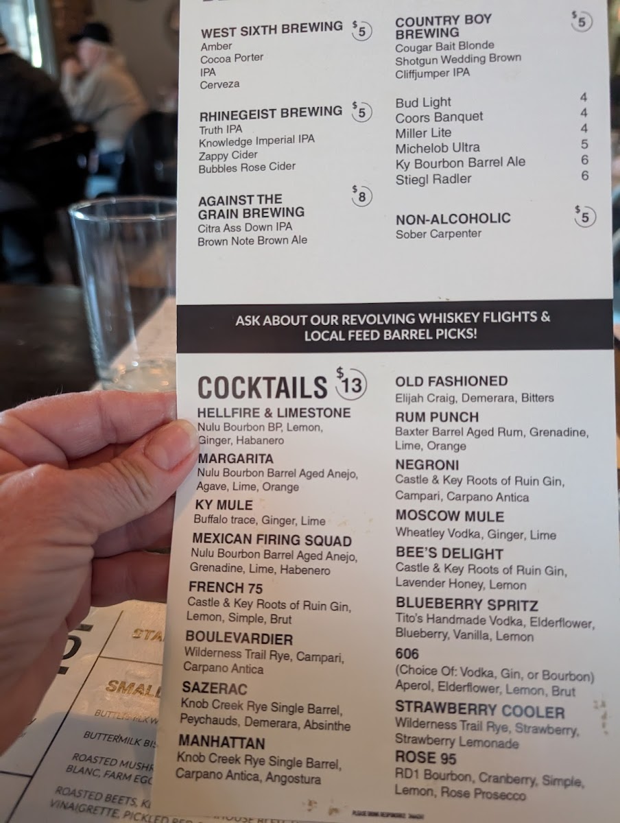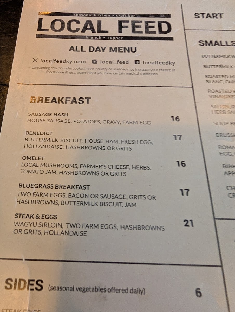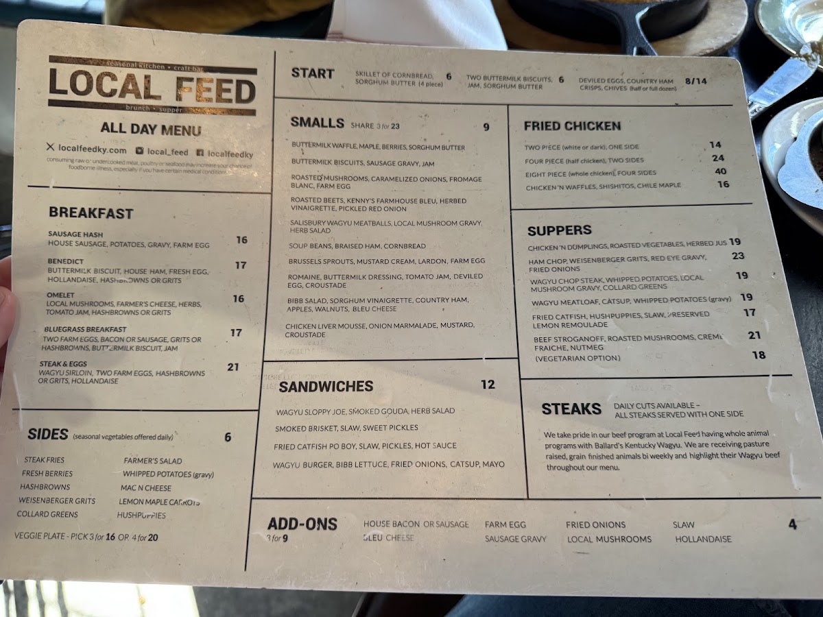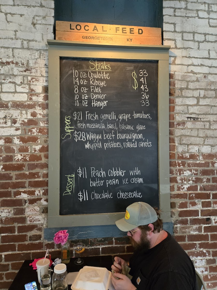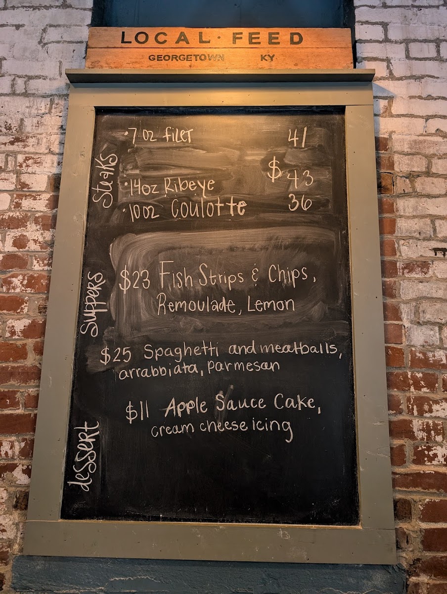 Daily cuts available - all steaks served with one side we take pride in our beef program at local feed having whole animal programs with blackhawk farms and ballard's kentucky wagyu. We are receiving pasture raised, grain fed animals bi weekly and highlight their wagyu beef throughout our menu.